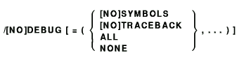 /[NO]DEBUG [ = (debug-clause,...) ] /DEBUG=(TRACEBACK,SYMBOLS)
