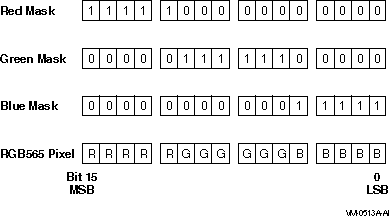 Figure 7-6 shows the definitions of the color masks and the bit organization of a pixel with RGB565 format.