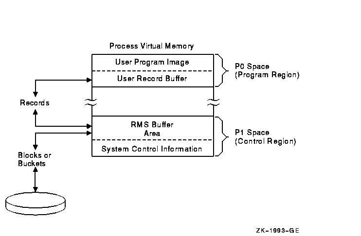 Your program perceives RMS record processing as the movement of records between a file and the program itself. In fact, RMS uses internal memory areas called I/O buffers to read or write blocks or buckets of data. Transparent to your program, RMS transfers blocks or buckets of a file into or from an I/O buffer. Records within the I/O buffer are then made available to the program when RMS transfers the records between the I/O buffer and the application program's record buffer.