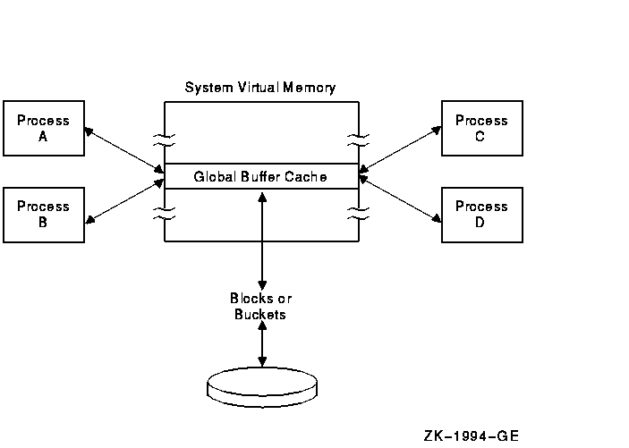 Unlike local buffers, global buffers can be accessed by multiple processes accessing the same file. When a record requested by one process is located in a global buffer, the record can be transferred directly from the global buffer to the program, eliminating an I/O read operation. Note that if the previous accessor modified the record, RMS writes the buffer to disk before returning the record to the new accessor. This ensures that the modified bucket in memory matches its counterpart on the disk.