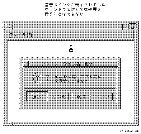 ユーザがポインタをアプリケーション・モード付きダイアログ・ボックスからアプリケーションの他のウィンドウに移動した際には, アプリケーションがポインタを警告ポインタの形に変えます。 この形の変更により, モード付きダイアログ・ボックスを解除するまでアプリケーションの他のウィンドウでは何も処理できないことを示します。 フル・アプリケーション付きダイアログ・ボックスを使用の場合は, この警告ポインタは,図 1-2 に示すように親ウィンドウ上に現われるだけでなく,そのアプリケーションに属する他のどのウィンドウ上にも現れます。