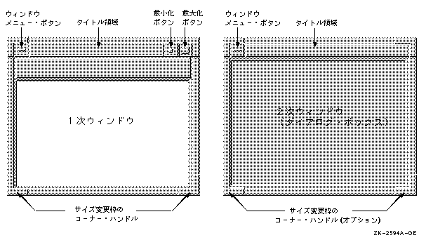 DECwindowsのアプリケーションは1つ以上の1次ウィンドウとそれに関連するダイアログ・ ボックスで構成されます。ダイアログ・ボックスは2次ウィンドウとも呼ばれます。Motif ウィンドウ・マネージャのもとでは,2次ウィンドウは次の特徴を持っています。