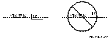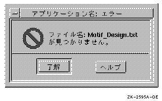 1次モード付きダイアログ・ボックスから祖先ウィンドウにポインタを移動させた際には, 使用アプリケーションがポインタを警告ポインタの形に変え, モード付きダイアログ・ボックスを画面から消去するまでは祖先ウィンドウでは何もできないことをはっきりと示します。 この警告ポインタは「進入禁止」を表わす国際的な記号です。図 1-2 は親ウィンドウで警告ポインタを表示した例です。