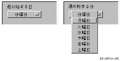 オプション・ボタンはオプション・メニューを表示します(オプション・ ボタンを,別のダイアログ・ボックスを起動する「オプション...」プッシュ・ ボタンとは混同しないでください。また,メニュー・バーにある「オプション」メニューとも混同しないでください) 。図 1-35に示すように, ユーザがオプション・ ボタンを押すとメニュー項目が表示されます。