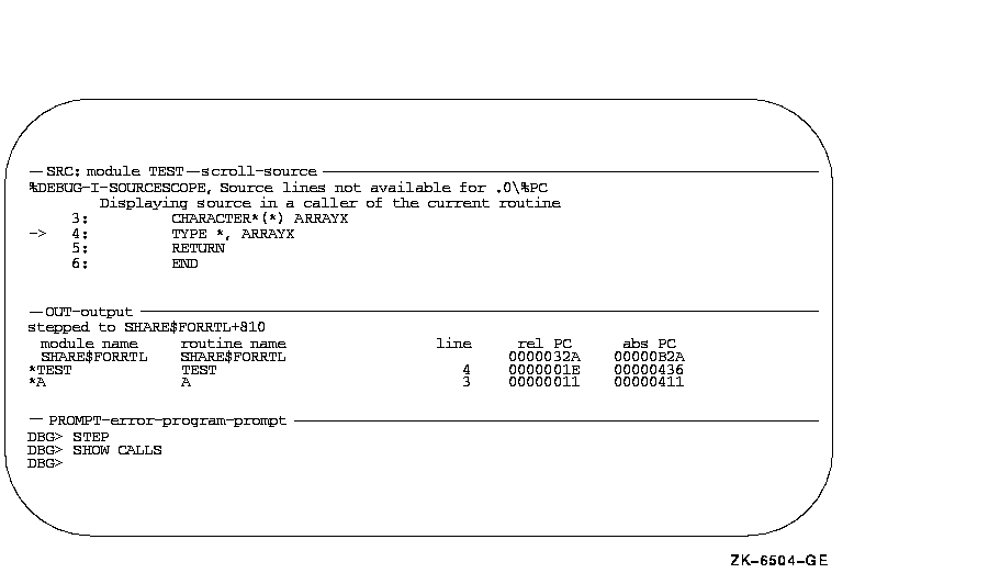 これは,指定したコマンドの出力によって自動的に更新されるソース・ディスプレイです。 そのコマンド(EXAMINE/SOURCEコマンドまたはTYPEコマンドでなければならない) は,デバッガがユーザ・プログラムから制御を受け取るたびに実行されます。