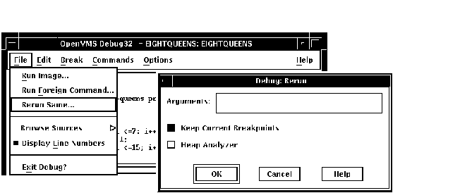 プログラムを再実行する場合,デバッガは,現在デバッガの制御下にあるイメージと同じバージョンのイメージを使用します。 同一のデバッグ・ セッションからそのプログラムの別のバージョン(または他のプログラム) をデバッグするには,メイン・ウィンドウの「File」メニューから「Run Image... 」または「Run Foreign Command..」を選択してください( 第9.1節を参照)。