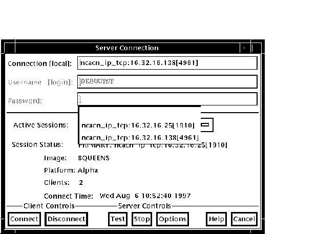 Motifデバッグ・クライアントからセッションを確立するには,「File」メニューの「Server Connection 」をクリックします。「Server Connection」ダイアログの「Connection」リストには,省略時の設定のネットワーク・ バインド文字列が表示されます。表示される文字列は直前に入力したものか, またはクライアントが実行されているノードとなります。 サーバを省略時の設定のバインド文字列に関連付ける必要はありません。 図 9-6に「Server Connection」ダイアログを示します。