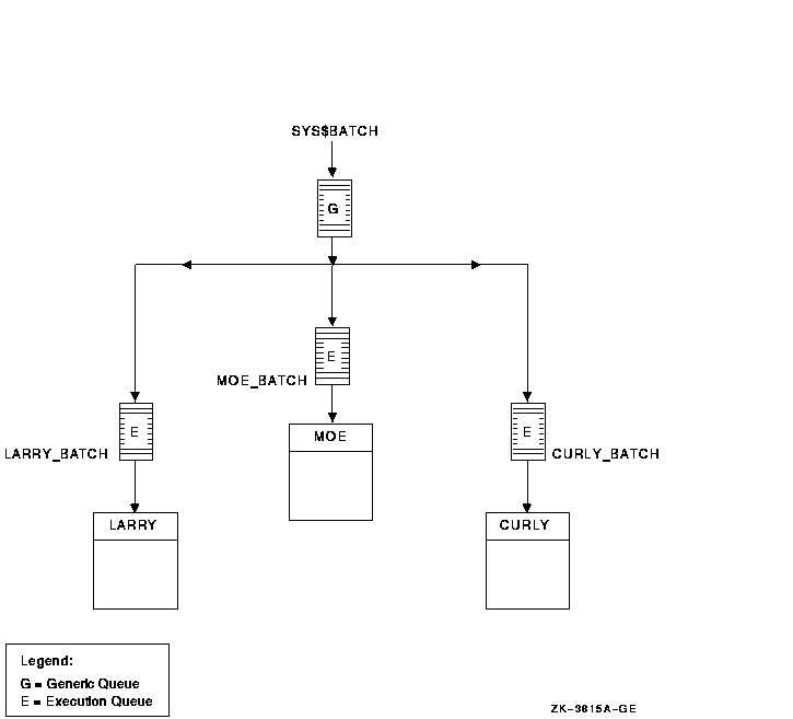 たとえば,実行キューのMOE_BATCH,LARRY_BATCH,およびCURLY_BATCHのジョブ制限量がすべて5 であると仮定します。MOE_BATCHとLARRY_BATCHが4 つのジョブを実行していて,CURLY_BATCHが1つのジョブしか実行していない場合, 汎用キューSYS$BATCHは次のジョブをCURLY_BATCHに送り込みます。