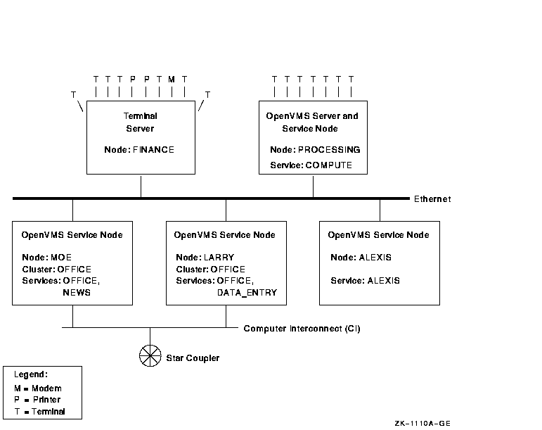 サービス・ノードのうちのNOE とLARRYは,コンピュータ・インタコネクト(CI) とスター・カプラによってクラスタOFFICEを形成しています。クラスタ化されているこの2 つのノードのサービス名はクラスタ名と同じになっています。 この2つのサービス・ノードはともにOFFICEサービスを提供するため, ターミナル・サーバ・ノードは両方のOFFICEノード上の作業負荷を調べ, 利用量が少ない方のサービスを提供するノードに対して接続を確立します。