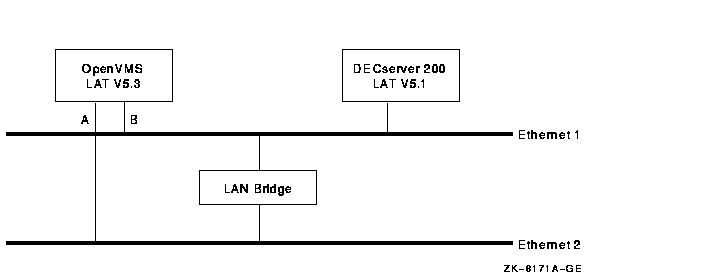 1つのLATノードに複数のLANアドレスを使用すれば,同じ論理LANに接続された複数のLAN アダプタを持つシステムを構成できます。LATソフトウェアは各アダプタで同時に実行でき, 接続も良好に維持されます。たとえば, 仮想サーキットで1次パスを選び,すべてのLATメッセージ転送に使用した場合には, もとのパスが遮断されても,LATソフトウェアは,別のアダプタまたは論理パスを介して通信を継続できます。
