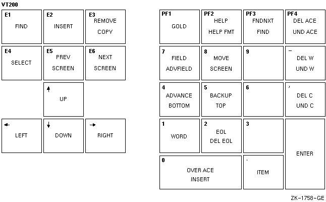 | FIND | GOLD-PF3 | 文字列のオカレンスを検索する。FIND キーを押し,メイン・キーボードから文字列を入力する。 現在の方向で文字列を検索する場合はENTERキーを押し,検索方向を変更する場合はADVANCE キーまたはBACKUPキーを押す。 |