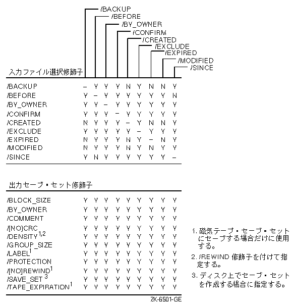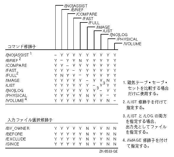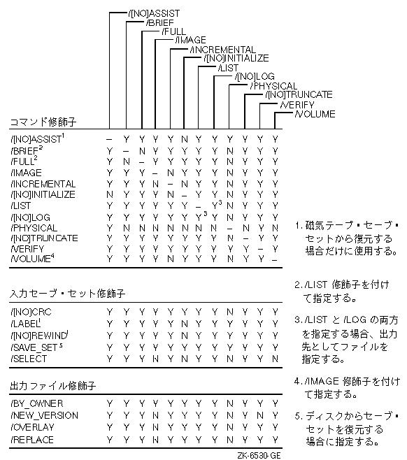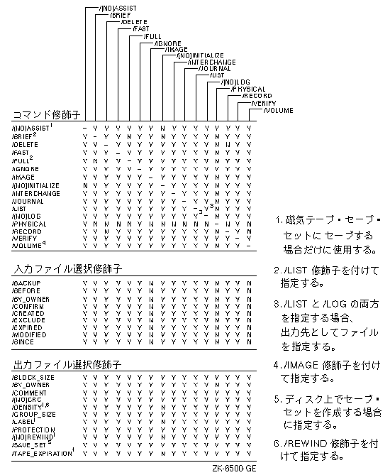 BACKUPのセーブ,復元,コピー,比較,リストの各動作で指定できる修飾子とそれらの組み合わせ方を, 図で示します。
