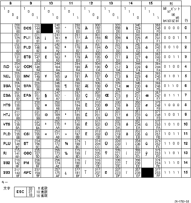 DEC各国語文字セットは,256文字からなる8ビット文字セットで,最初の128 文字がASCII文字セットに対応します。それぞれの文字は,0〜255の10 進値を持っています。