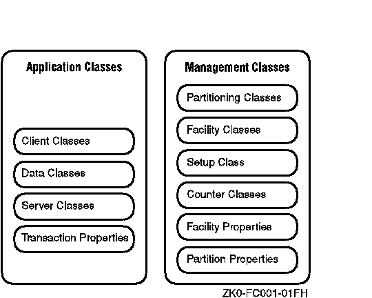 Figure 1-1 shows the C++ foundation classes. Management classes represent RTR, facilities, partitions, and key segments (part of the partitioning classes in Figure 1-1 whereas application classes represent transactions, data, messages and events.