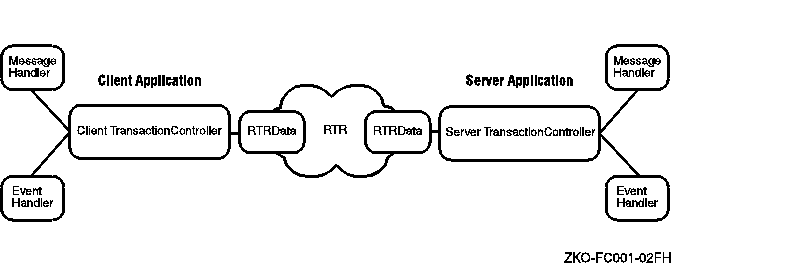 Figure 1-2 illustrates the client and server classes and the paths through which they typically communicate. (There are design alternatives to the illustrated path.) TransactionController objects control transactions. Communication between client and server applications is through messages and events sent and received by the RTR application. Data objects (instances of data classes) carry these messages and events between RTR clients and servers.