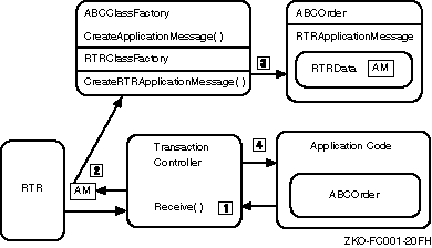 When the application calls Receive, the transaction controller determines what kind of message or event is about to be received, and then calls the appropriate method in the application-derived and registered class factory object (for example, CreateRTRMessage). This method creates the appropriate data object (for example, an RTRMessage object) and returns it to the transaction controller. The transaction controller copies the incoming data into the data object returned from the class factory and returns back to the application's call to Receive().