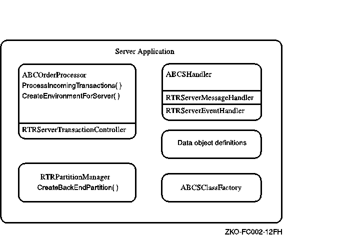 The following figure illustrates the objects within the ABCOrderProcessor server application. Each of the four server classes derives from the associated base classes.