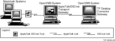 In Figure 8-3, the TP Desktop Connector gateway can reside on the same system as the AppleTalk-DECnet Transport gateway, although this is not a requirement.