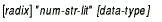 Num-str-lit is a numeric string literal. It can be the digits 0 and 1 when the radix is binary, the digits 0 to 7 when the radix is octal, the digits 0 to F when the radix is hexadecimal, and the digits 0 to 9 when the radix is decimal. When the radix is ASCII, num-str-lit can be any valid ASCII character.