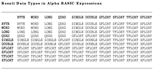 The following chart shows the data type of the result of an operation that combines arguments of differing data types. Alpha BASIC first promotes, if necessary, the arguments to the result data type, and then performs the operation.