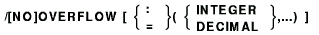 The /OVERFLOW qualifier causes VAX BASIC to report arithmetic overflow for operations on integer or packed decimal data, or both. If you specify /NOOVERFLOW, VAX BASIC does not report arithmetic overflows. The default is /OVERFLOW=(INTEGER,DECIMAL).