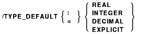 The /TYPE_DEFAULT qualifier sets the default data type (REAL, INTEGER, or DECIMAL) for all data not explicitly typed in your program or specifies that all data must be explicitly typed (EXPLICIT). The following list describes the /TYPE_DEFAULT variables: