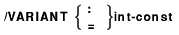 The /VARIANT qualifier establishes int-const as a value to be used in compiler directives. The variant value can be referenced in a lexical expression with the lexical function, %VARIANT. Int-const always has a data type of LONG. The default is /VARIANT=0.