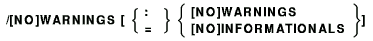 The /WARNINGS qualifier causes VAX BASIC to display warning or informational messages, or both. If you specify /WARNINGS but do not specify a warning clause, VAX BASIC displays both warnings and informational messages. If you specify /NOWARNINGS, VAX BASIC does not display warning and informational messages. The default is /WARNINGS.
