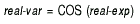 2. BASIC expects the argument of the COS function to be a real expression. When the argument is a real expression, BASIC returns a value of the same floating-point size. When the argument is not a real expression, BASIC converts the argument to the default floating-point size and returns a value of the default floating-point size.