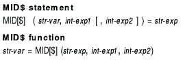 MID$ can be used either as a statement or as a function. The MID$ statement performs substring insertion into a string. The MID$ function extracts a specified substring from a string expression.