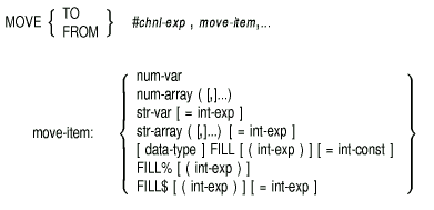The MOVE statement transfers data between a record buffer and a list of variables.