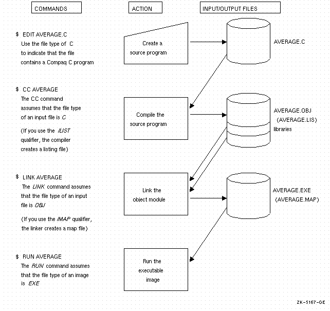To create a Compaq C source program at DCL level, you must invoke a text editor. In Figure 1-1, the EDIT command invokes the default editor EDT to create the source program AVERAGE.C. You can use another editor, such as the OpenVMS Text Processing Utility (TPU) or the Compaq Language-Sensitive Editor (LSE). (LSE is a product that must be purchased separately; see Appendix C for more information.) A file type of C is used to indicate that you are creating a Compaq C source program. C is the conventional file type for all Compaq C source programs.