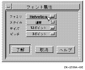 頻繁にテキストをカスタマイズする場合は,ポイント・サイズ,フォントの種類の選択肢を1 つのダイアログ・ボックスに統合して,1回のカスタマイズのために複数のメニューを表示しなくてもいいように設計してください。 たとえば,図 3-6のようなダイアログ・ ボックスを作成してください。