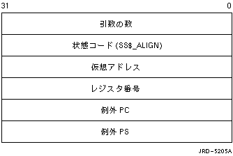 このシグナル・アレイには,SS$_ALIGN例外固有の2つの引数が格納されます。 それは仮想アドレスとレジスタ番号です。仮想アドレスには, アクセスしているアラインされていないデータのアドレスが格納されます。 レジスタ番号は操作の対象となるレジスタを示します。
