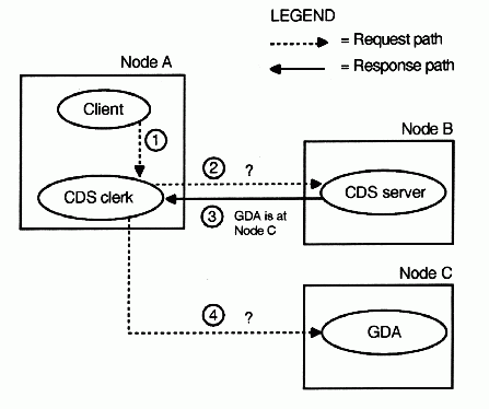 The GDA is an intermediary between CDS clerks in the local cell and CDS servers in other cells. A CDS clerk treats the GDA like any other name server, passing it name lookup requests.