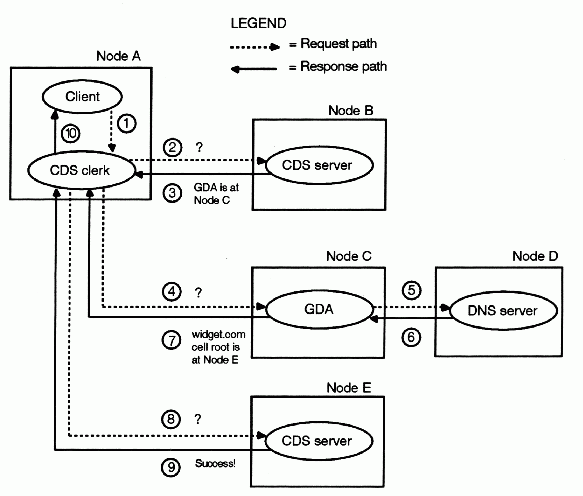 5. The GDA recognizes that the name is a DNS-style name, so it assumes that the second component is a cell name that is defined in DNS. It passes that portion of the name (widget.com) to
