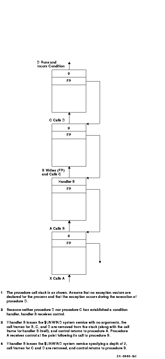 Thus, in Figure 9-13, handler B can be called a second time, during the unwind operation. Note that handler B does not have to be able to interpret the SS$_UNWIND status value specifically; the RET instruction merely returns control to the unwind procedure, which does not check any status values.