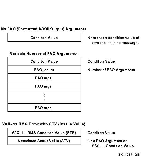 Rather than have each calling program determine the meaning of the STV value, SYS$PUTMSG performs the necessary processing. Therefore, this STV value must always be passed in place of the FAO argument count. In other words, an RMS message sequence always consists of two arguments (passed by immediate value): an STS value and an STV value.