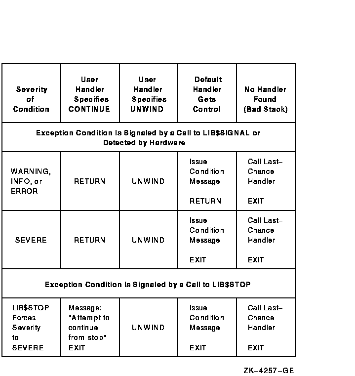 Several results are possible after a routine signals, depending on a number of factors, such as the severity of the error, the method of generating the signal, and the action of the condition handlers you have defined and the default handlers. Given the severity of the condition and the method of signaling, Figure 9-12 lists all combinations of interaction between user condition handlers and default condition handlers.