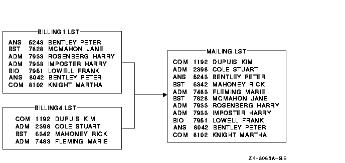 $ MERGE/KEY=(POSITION:5,SIZE:4,DECIMAL) - _$ BILLING1.LST,BILLING4.LST MAILING.LST |