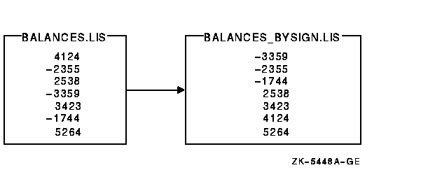 ! Specification file for sorting negative and positive data ! in ascending order ! /FIELD=(NAME=SIGN,POS:1,SIZ:1) (1) /FIELD=(NAME=AMT,POS:2,SIZ:4) (2) /CONDITION=(NAME=CHECK1, (3) TEST=(SIGN EQ "-")) /CONDITION=(NAME=CHECK2, (4) TEST=(SIGN EQ " ")) /INCLUDE=(CONDITION=CHECK1, (5) KEY=(AMT,DESCENDING), DATA=SIGN, DATA=AMT) /INCLUDE=(CONDITION=CHECK2, (6) KEY=(AMT,ASCENDING), DATA=SIGN, DATA=AMT) |