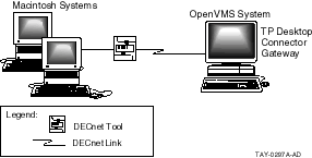 In Figure 8-3, the TP Desktop Connector gateway can reside on the same system as the AppleTalk-DECnet Transport gateway, although this is not a requirement.