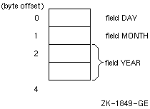 Figure 4-5 shows the memory mapping of any record or record array element with the structure DATE: