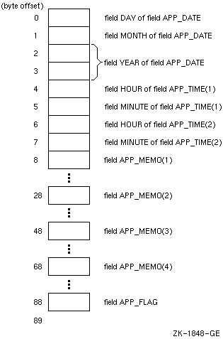 Figure 4-6 shows the memory mapping of any record or record array element with the structure APPOINTMENT.