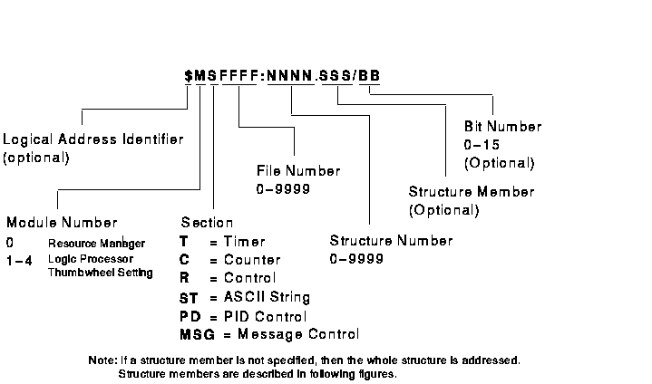 Figure 3-24 shows the structure of a legal Timer, Counter, Control, ASCII String, PID Control or Message Control data table address for the PLC-5/250.
