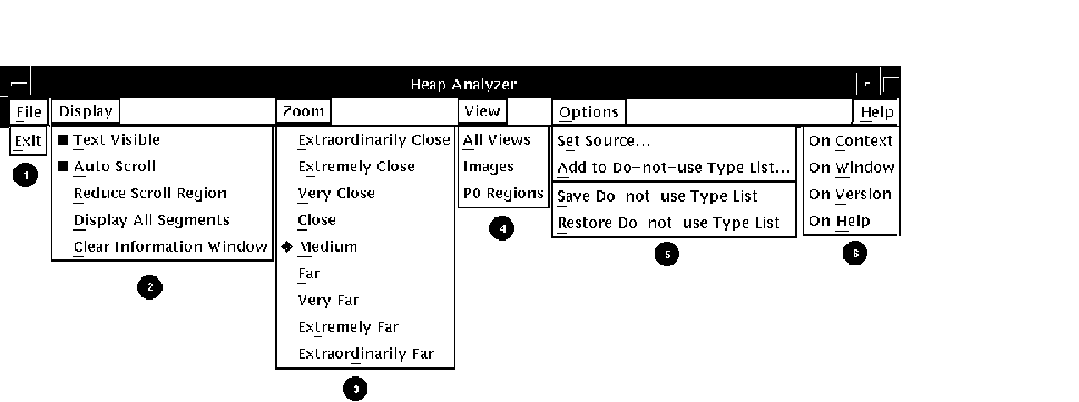 ヒープ・アナライザの「Memory Map」の上には5つのプルダウン・メニューがあります( 図 12-2を参照)。メニュー項目をすべて示すために, この図は少し修正してあります。