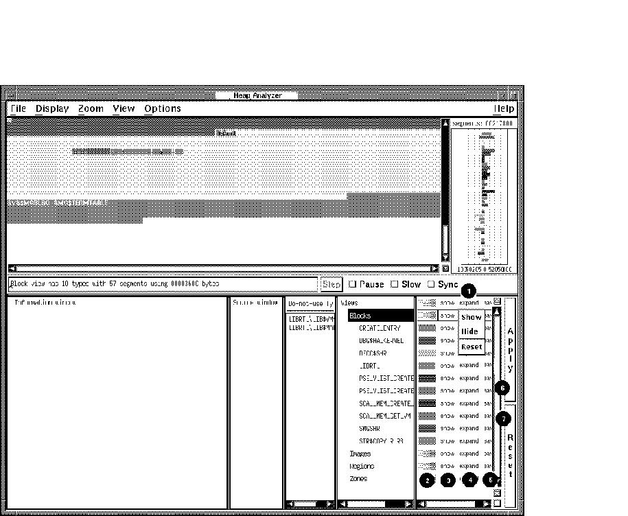 各メモリ・マネージャが認識している個々のセグメント・タイプを表示するには, 「Blocks」,「Images」,「Regions」,「Zones」の各キーワードをMB1 でダブル・クリックして,省略時設定の表示を拡大します。それぞれの表示を元に戻すには, 前に選択したキーワードをMB3でクリックします。
