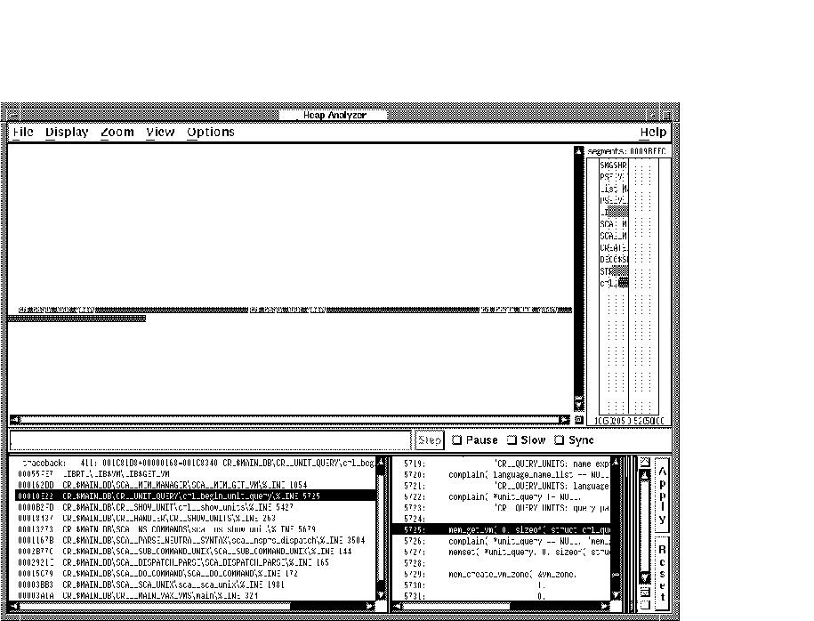 問題点を個々の割り当てにまで絞りこんだ後は,トレースバック情報を表示できます。 ヒープ・アナライザでは,割り当てのトレースバック・エントリをアプリケーション・ プログラムのソース・コードと相互に対応させることができます。 それからソース・コード・ディスプレイをスクロールして調べていけば, 問題のあるコードを特定でき,どう修正したらいいかを決定することができます。