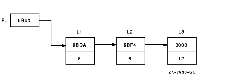 次の例では,内容演算子(アットマークまたはピリオド)と現在の記憶位置演算子( ピリオド)を使用して,3つのクォドワード整数ポインタ変数がリンクされたリスト( 次の図のL1,L2,L3)を検査します。Pはリストの開始点へのポインタです。 各ポインタ変数の上の方のロングワードには次の変数のアドレスが入り, 下の方のロングワードには整数値(それぞれ8,6, 12)が入っています。