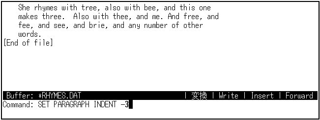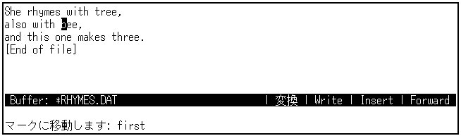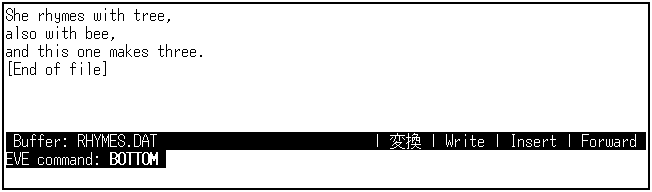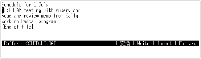 日本語EVEは,カーソルをバッファの先頭に移動し, ユーザがテキストを入力するのを待ちます。 次に示すテキストをSCHEDULE.DATファイルに入力すると, [End of file]マーカはバッファ内で下に移動します。